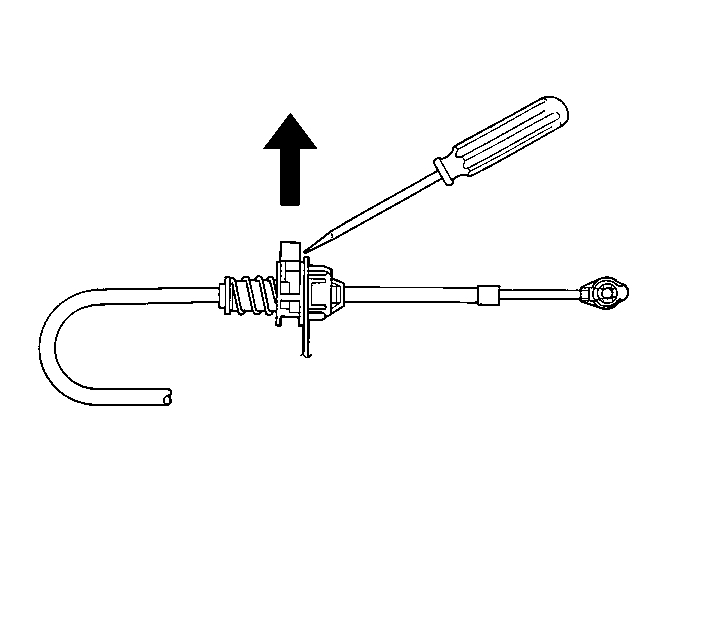 3. Use an appropriate tool to pry on the automatic transaxle range selector cable terminal at the automatic transaxle range selector lever pin to remove the automatic transaxle range selector cable terminal from the transaxle manual shaft lever pin. DO NOT pry and DO NOT pull up on any other part of the automatic transaxle range selector cable or damage may occur.