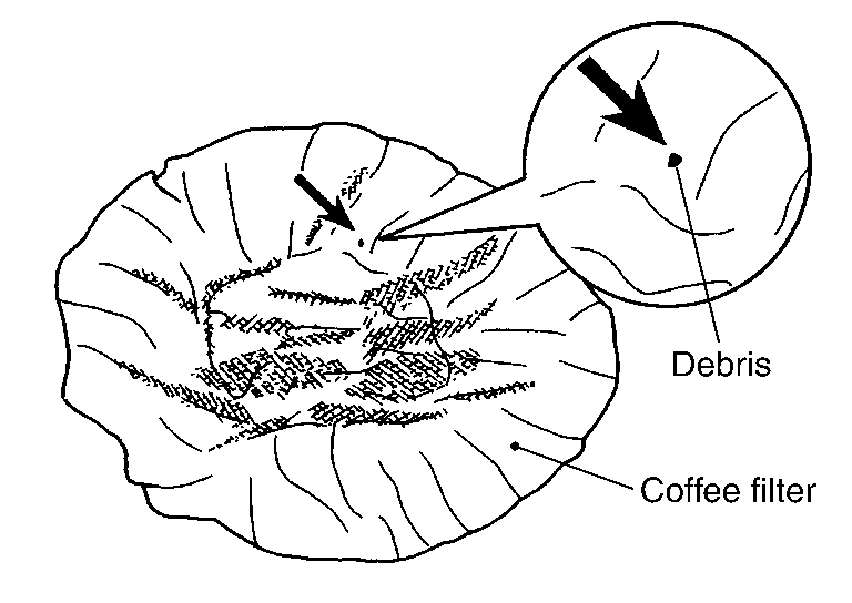 a. If small metal debris less than 1 mm (0.040 in) in size or metal powder is found in the coffee filter, this is normal. If normal debris is found, the CVT fluid cooler/radiator can be re-used and the procedure is ended.