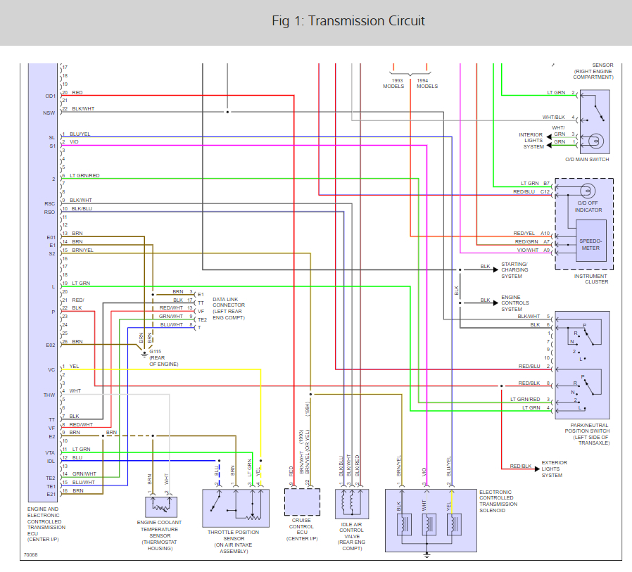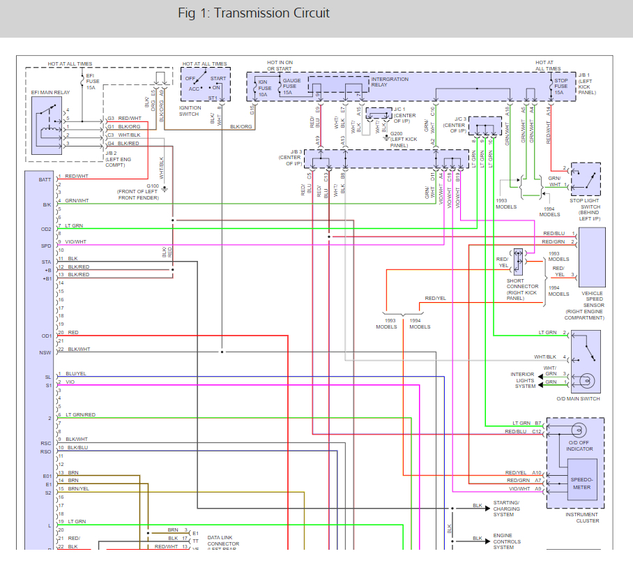 As for the speedometer issue. That signal is also used to control shift points, with it missing it can cause multiple issues with the transmission controls. It looks like that signal is on the violet/white stripe wire from the speed sensor.