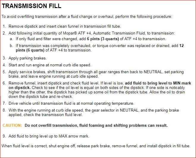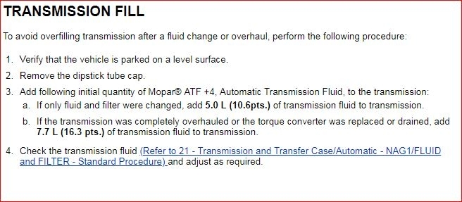 How many quarts of fluid did you put back in? Which transmission do you have? NAG or 42RLE? I included the fluid spec for both.