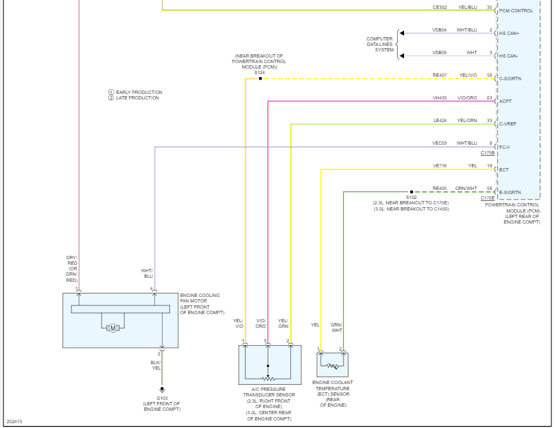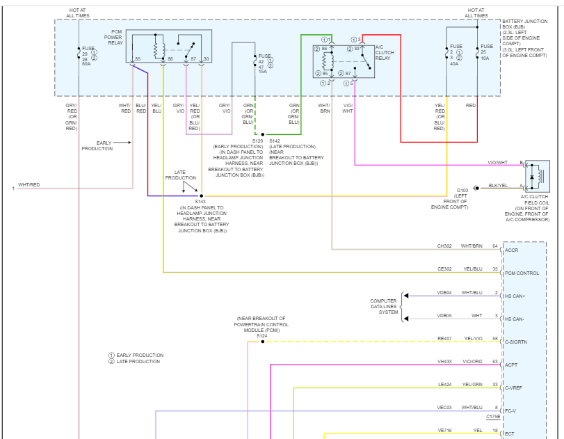 Okay, take a look below. I need you to check the two wires I circled for power with the key on and the ac turned on. If you have power, We know the wire to the compressor is good, so the brown wire with a white tracer is the last possibility. That wire is grounded at the PCM. If we have power at both of the ones I mentioned, then the ground path must not be working.