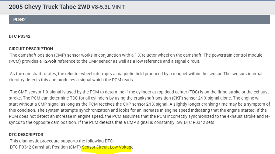 The code indicates a low voltage issue to or from the sensor. In this case, it can be a connector issue, a broken wire, a short-to-ground issue, or even a failing PCM.