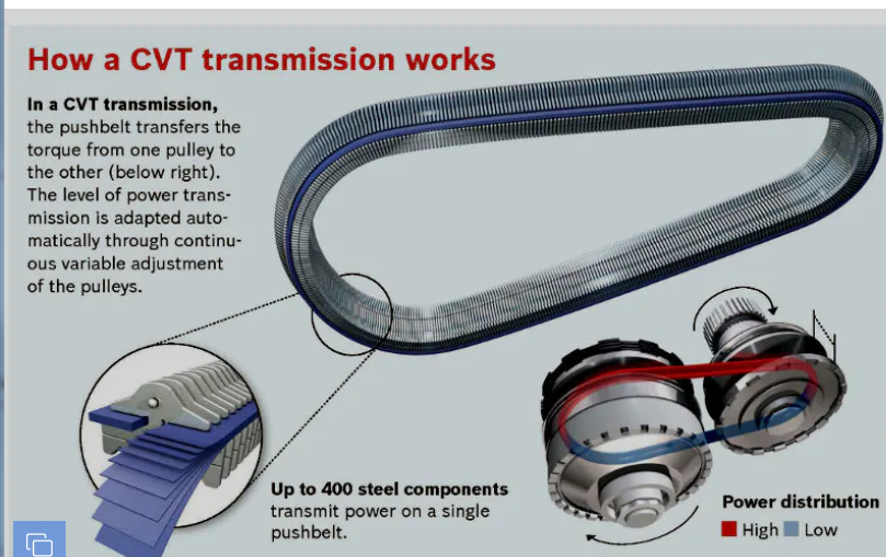 The way the CVT works is there is a steel belt inside it that as the RPMs raise to go faster the pulley diameter inside the transmission changes so that the speed of the output shaft increases with no shifting gears.