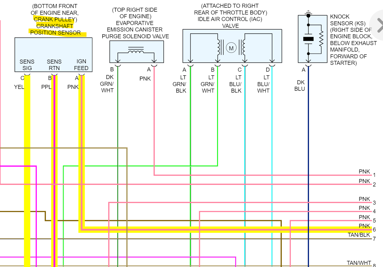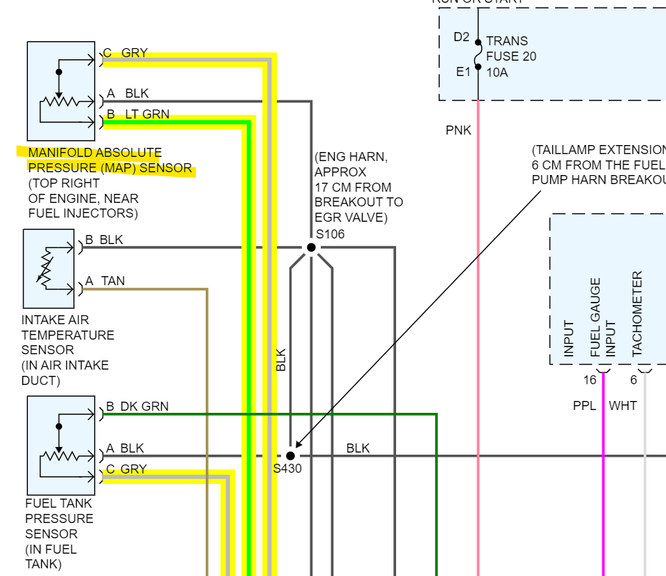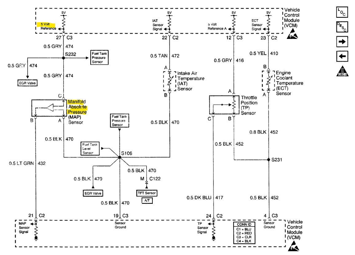 If you have any questions on these tests, just ask, I think the MAP sensor code, if the voltage feed is ok, is being caused by the timing being off. When you go to take off and it stalls out, that Cam Offset may be the issue. The map sensor measures the intake manifold pressure/vacuum and if timing is off the manifold vacuum will be off. But I will post the wiring diagrams for the crank and cam sensors so you can check the voltage to them as well.