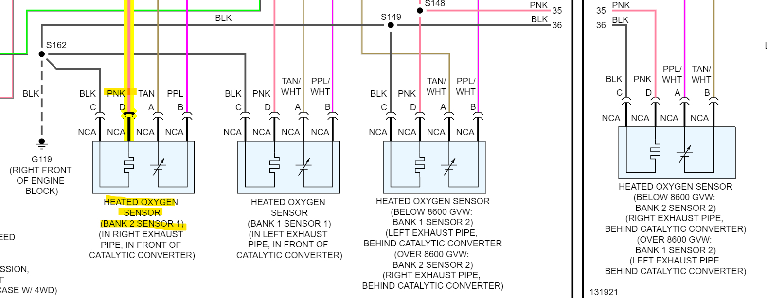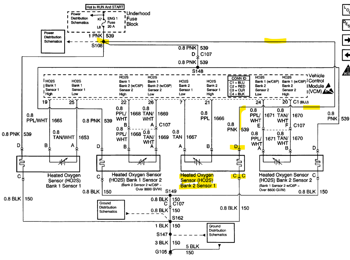 Next, you'll need to check the Oxygen sensor heater circuit for the Bank 2 Sensor 1. So, Bank 2 is going to be the passenger side and the front oxygen sensor, with the key On, the pink wire should have 12volts and the black wire is the Ground for the heater. If you unplug the Bank 2 sensor 1 oxygen sensor and have 12volts across the Pink and Black wire, then you'll need to check the resistance of those same wires, but across the sensor. If there is 12volts on the pink and black, then most likely the sensor has an open circuit inside it. And the resistance check across the sensor plug with show OL on the meter. Meaning it's an open circuit inside and the sensor needs to be replaced.