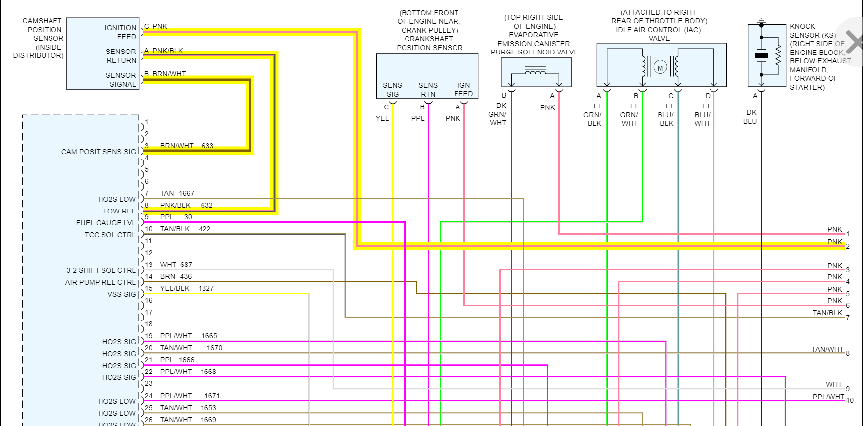 The cam sensor, same thing, the pink wire is 12v and the pink/black wire is the Ground, with key on both should read 12-volts.