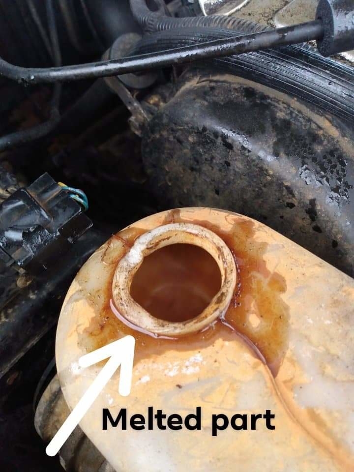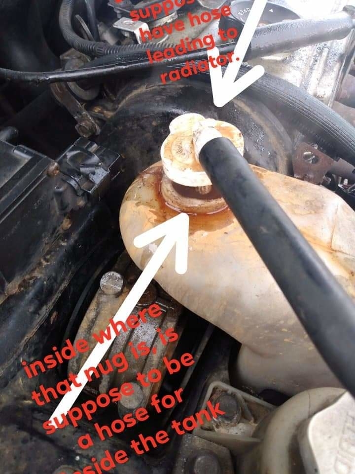I bought this car from from my cousin who knows nothing about cars. She stopped driving it because it overheated. So i bought it, and found out the hose closest to the window was leaking coolant, so i replaced that with a new hose, drained the radiator, and then put new coolant in. It then worked from the 8th until Friday the 1st, it started to overheat. So i then notice that my coolant t-tank (overflow) where the cap is has been melted and the part of cap where hose goes from there to radiator was broken and no longer attached. And that there isn't a hose going inside the coolant tank. So i get a new coolant cap, and a hose for inside of it and connected the hose to the new cap leading to radiator. As well, as replacing the thermostat. I then , drain radiator, and fill the radiator (where metal cap is) with coolant until i see fluid. I let my car run for a minute to let it circulate. After a couple minutes, i then pour more coolant in the radiator cap and then i fill the coolant t-tank with coolant up to the full line. Let my car circulate, and then i have to fill the t-tank up a little more. After this, my heat started working, car wasn't overheating etc. Driving just fine for my 50 minute drive, and i let: the car sit for about an hour or so. I then drive 10 minutes down the road to the store and when. I get done with the store i go back to my car and when starting it, it has a little trouble starting but does. At: that point it slightly sounded like it was going to stall, so i rev the engine up , thinking it maybe because it's so cold, and then go on with driving. I get back to the house and after 20 minutes of letting it cool down, i check my t-tank and it's completely emptied. So i'm thinking the engine didn't get enough coolant to stay circulated or whatever, so i then fill the radiator with more coolant until i see fluid, and then fill the t-tank up until the full line. During all of this, i'm checking for any leaks, none, and checked my oil- seemed a little low but couldn't really tell so i put more oil on, just a tad. Now i'm getting ready to drive somewhere else , has a little trouble starting but does and kinda spurts/jerk when i put it in drive and start going. After about 4 minutes it's fine. So, i wanted to make sure coolant level was good and oil, so 10 minutes into the drive i stop pull over , let it cool down and check my levels. Coolant tank is a little below full line, oil is good, so i put more coolant in the radiator spot. I try starting the car and it has a longer time starting, so i press the gas a little and it goes but it's jerking/sputtering i guess . While i'm driving down the highway, it starts to seem like it's having trouble going so i press the gas even more to try to keep it started and couple mins later i get to a stop sign, and when i try to go my car stalls in the middle of my turn. I was able to start the car again, but it took at least a minute to get it started while having to press the gas quite a bit to start, after that i'm steadily holding the car at 50 mph until i get back to where i was. I get there and when i come to a stop it stalls. So now, my car is midway in the garage, won't start. Now it will turn over, you hear it wanting to start but won't like it's too cold or something. Every time i try to start it and it won't, or when it does for 2 seconds, it shuts off and i hear boiling fluids like i did when the cap of the t-tank was slightly off because of it melting the ring on top of tank. Now, the cap is completely on the tank, coolant is in the tank, oil seems fine. I'm just trying to figure out what else to do. So when i look underneath my car there's 2 big pipes looks like coming from the engine where you fill oil at, is dripping midway underneath front of car. The liquid hitting the ground is a very light brown color, and couldn't really tell the smell. Any suggestions? Pictures attached are the old t-tank before replacement. The picture with 2 hoses, there was a tiny house underneath those that was replaced .