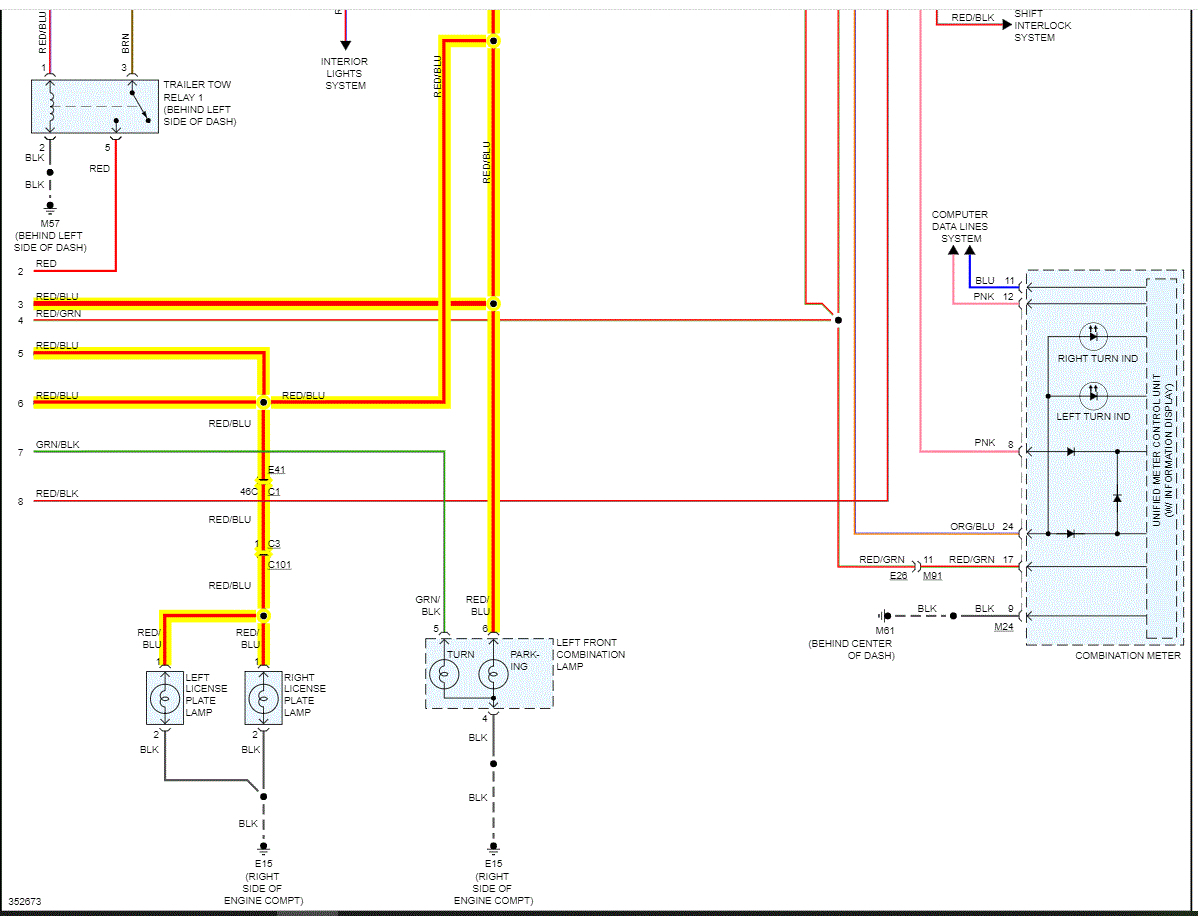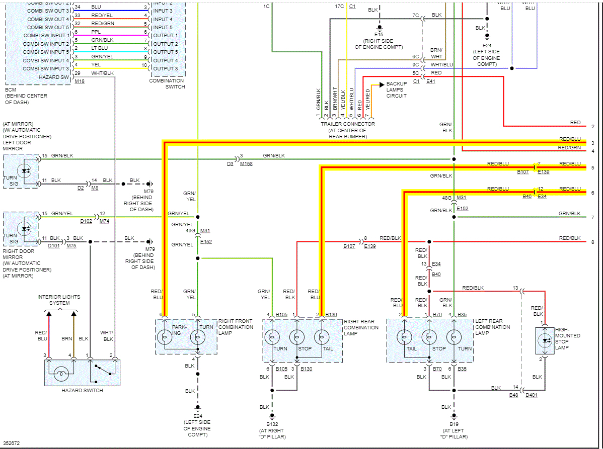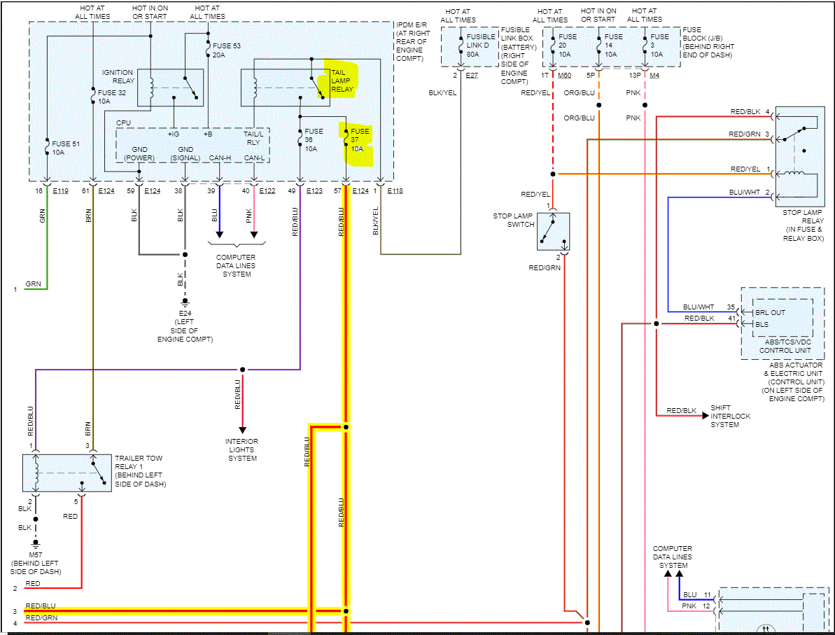 Next, there are two fuses I want you to check. Fuse 37 in the fuse box (under hood) is for the taillights. Remove it and see if the lights turn off. If they don't, then we have a short to power after the light switch.
