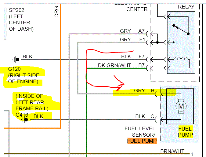 Now, if you look at the pic, you see a gray wire that feeds power to the pump and injectors. I need you to jump the power wire to the relay with the gray wire to the pump. Do this and see if the pump turns on.