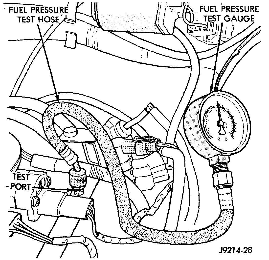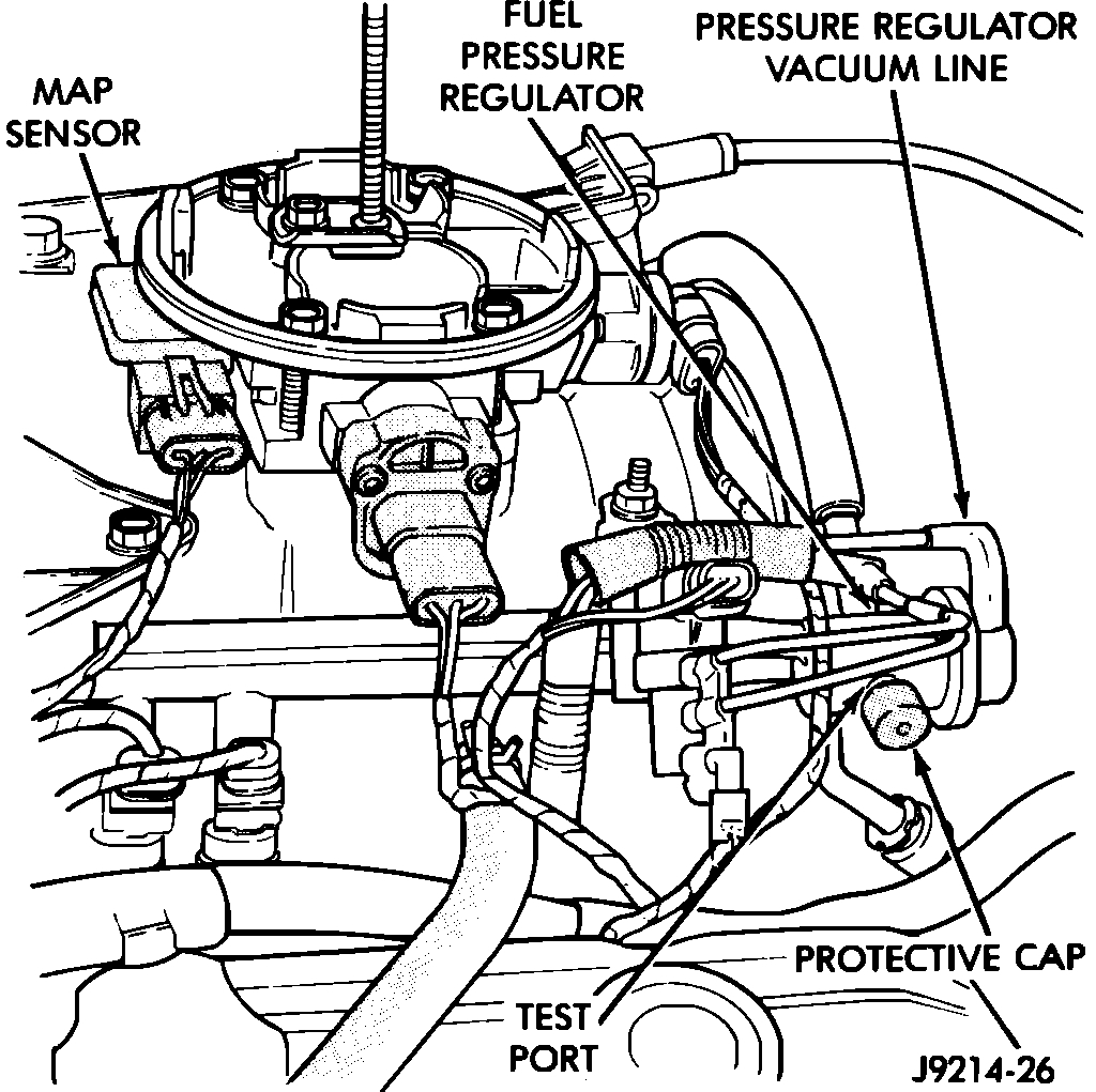 Fuel systems on these vehicles are equipped with a vacuum assisted fuel pressure regulator. With engine at idle speed, system fuel pressure should be approximately 214 kPa (31 psi) with the vacuum line connected to the regulator. With the vacuum line disconnected from the regulator, fuel pressure should be approximately 269 kPa (39 psi). This is 55-69 kPa (8-10 psi) higher.
