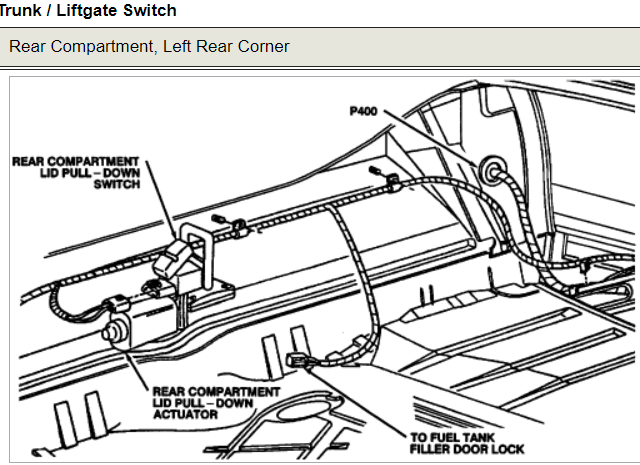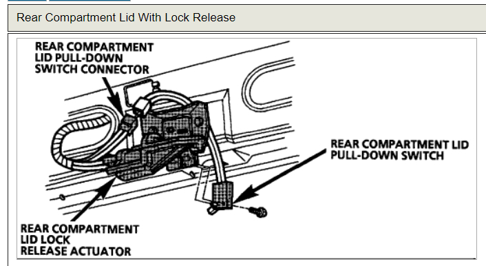 Ken, I have unplugged the lid pull-down actuator so that trunk shuts manually. i do not have the time or money and know how to have the electrical problem fixed or do it myself. My problem now is that when i operate my lights the license plate lamp will work but only when the trunk is open. When i close my trunk the license plate lamp shuts off simultaneously with the trunk lamp. Can i just run a wire from my parking lamp to my license plate lamp to make sure the license plate lamp comes on when headlights come on? Where did you get the diagram pictures from? can you send me a link? Thanks for for time! Carl