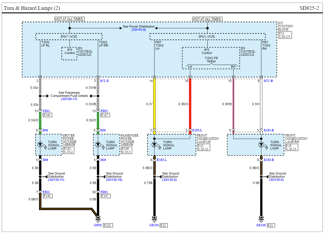 It sounds like you have a bad IPS control module which is inside the ICU junction block, there are no fuses for the blinkers specifically. Here are the blinker wiring diagrams so you can see how the system works.