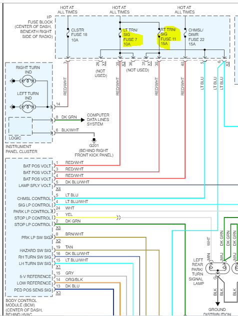 This vehicle doesn't have a traditional flasher unit for the signals. Instead, the body control module (BCM) controls the vehicle turn signals based on inputs from the turn signal/multifunction switch. With the turn signal/multifunction switch in either the left or right turn position, a ground is applied through the turn signal switch signal circuit to the BCM indicating a turn signal request. When the specific request is seen, the BCM then applies a pulsating voltage through the front and rear turn signal supply voltage circuits illuminating the turn signal lamps.