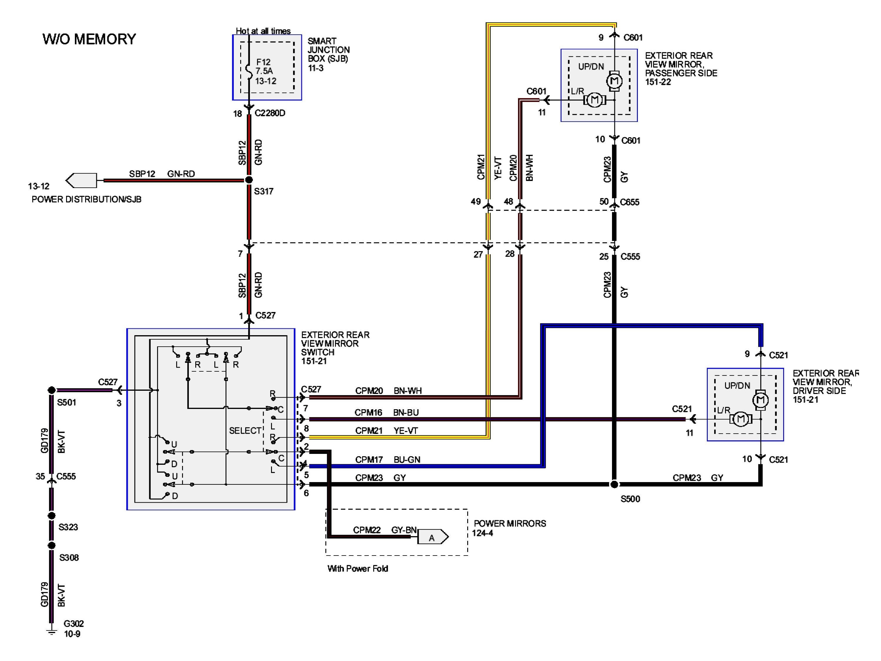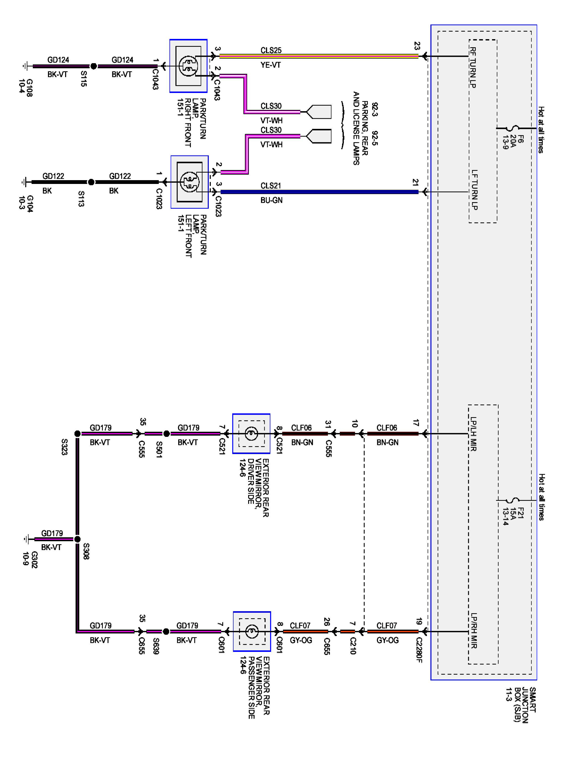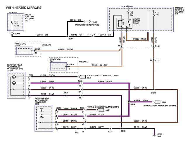 OK, this should be the wiring for the heated and lighted mirror wires for the 2008 F250. Looking at the schematic yours may be operating correctly for the way the 08 works. Looks like they are fed marker lamps, and turn/stop. So it should have running lights. Then the Turn/Brake/Hazard lamps as well.
