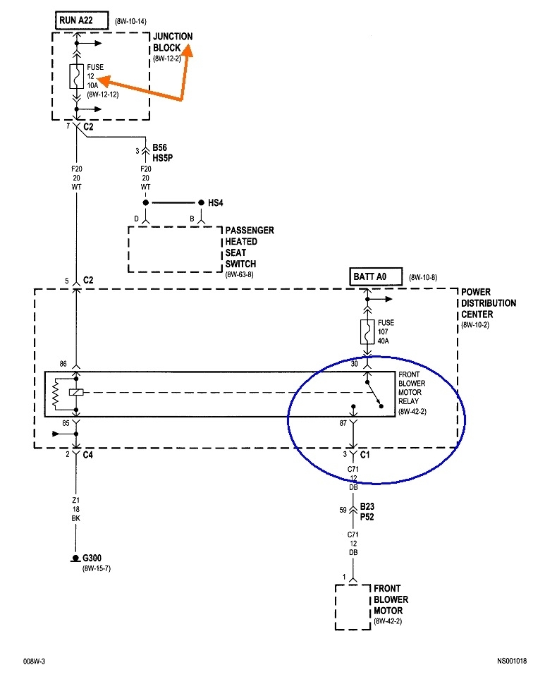 The first diagram shows the blower fan relay is powered through fuse 12 in the Junction Box, and that comes from circuit "Run A22" which comes from the ignition switch. Let me point out that it is fairly common to find two overheated terminals in the ignition switch connector, and those are for the section that turns the heater fan on. These fail most often for owners who are in the habit of turning the ignition switch on and off while the heater fan is set to one of the higher speeds. That causes a lot of arcing across the contacts in that part of the ignition switch, which leads to the overheated switch and terminals. In this case we have to look further back because the power locks have nothing to do with the ignition switch.