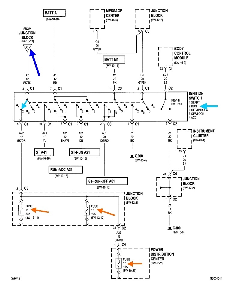 The second diagram shows circuit "Run A22". Three fuses are powered through that circuit, including the middle of the three orange arrows. That's the one we just looked at for the blower fan relay. There's actually six individual switches in the ignition switch assembly. The light blue arrow shows where that part will be when it's in the "run" position, position number 2. That circuit is powered through wire A2 12PK/BK "A" wires come from the battery. This is circuit number 2, and it's a 12-gauge pink / black wire. The dark blue arrow shows we have to work back to point "C" on the preceding diagram. That's the third one I posted.