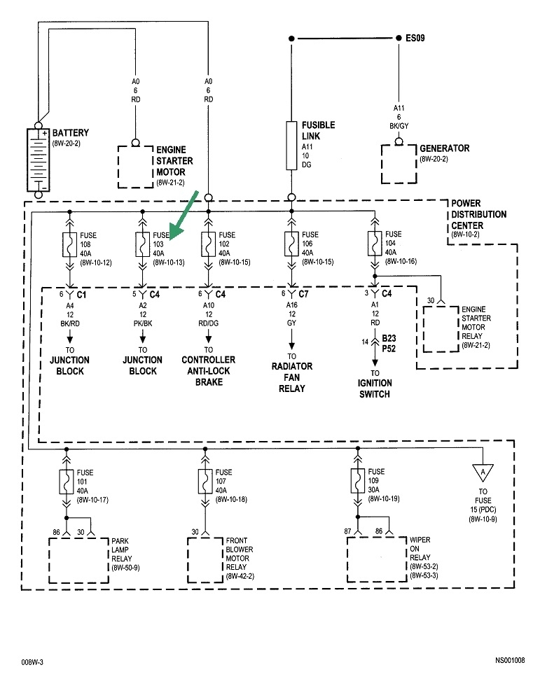 The break has to be in this circuit, but the fuse is not blown because the systems in question would never work intermittently as yours are. The fourth diagram shows eight fuses, plus others not shown on this part, that are all tied together and fed from the battery. All of those other circuits do not quit, so we know everything has to be okay up to that point. While there is a place where there could be a break inside the fuse box, it is much more likely we're going to find fuse 103 has corroded terminals, or one of the wires is corroded off its terminal under that fuse's socket.