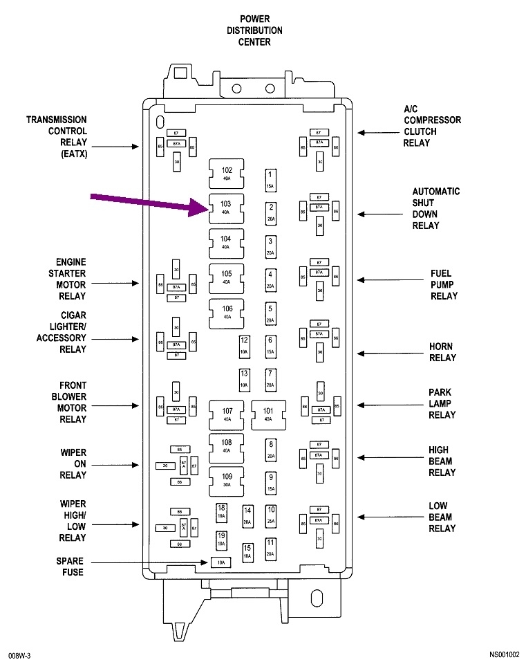 Point "C" is pointed out by the purple arrow. If you follow that back up, you'll see it comes from fuse 103, a 40-amp. That's going to be a large one physically. And guess what? That came through the Junction Block where it's also feeding the door lock relays.