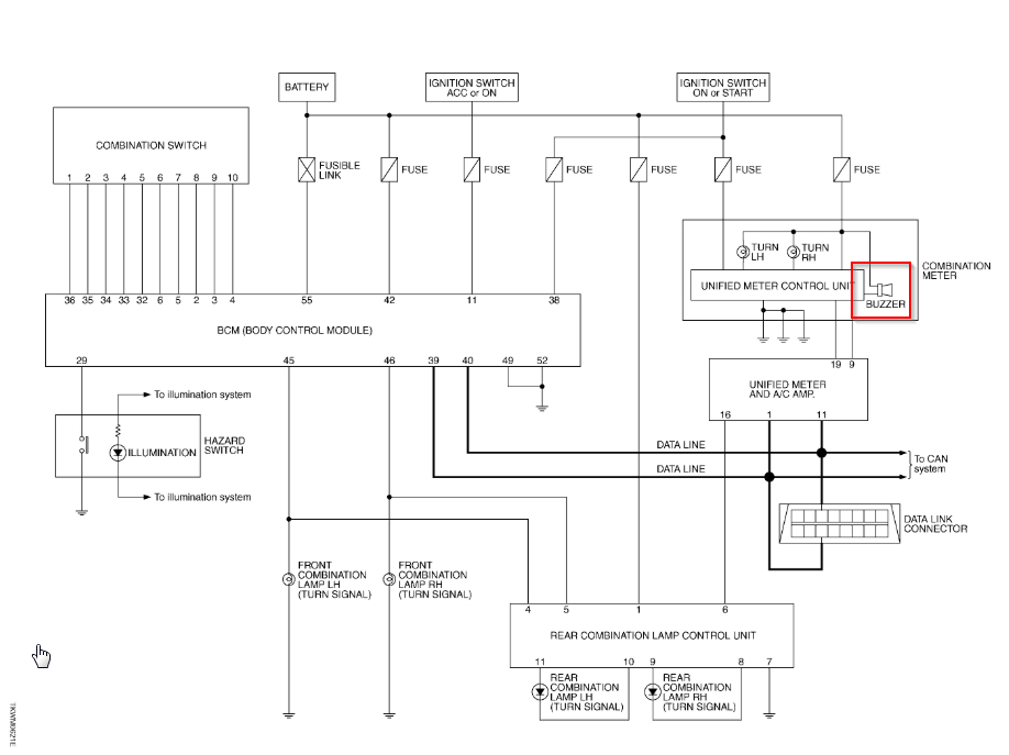 This is actually part of the combination meter. Take a look at the attachments and you will see I circled the "buzzer" that is what actually makes the sound on your vehicle. It used to be the actual flasher that would make this noise and you would hear the clicking of the relay contacts but your vehicle doesn't have one. The BCM is what controls the turn signals so they had to introduce this noise so that people know that their turn signal was on.