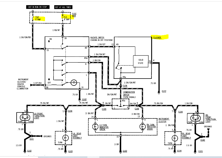 Because of the model year, the wiring schematics are limited. However, I was able to find one specific to the turn signals.