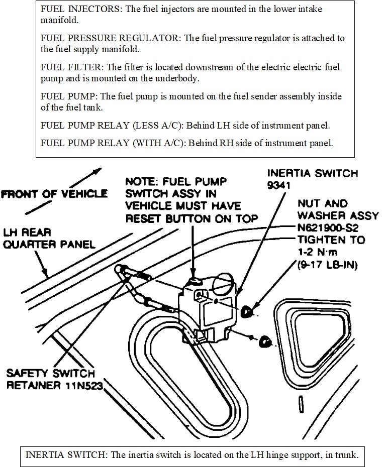 Next is to check if the fuel pump runs. Listen under the gas tank or by the filler pipe when a helper turns the ignition switch to "run". You should hear the hum of the pump for one to two seconds, then it will turn off. If you don't hear that, I'll find the diagram showing which fuse to check and the location of the inertia switch that may need to be reset.