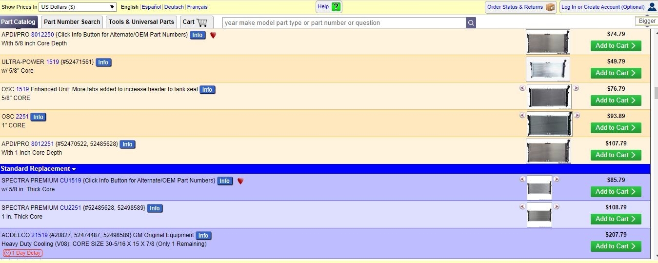 There are 2 options for the radiator. They are both listed below. Rock auto has them both for you.