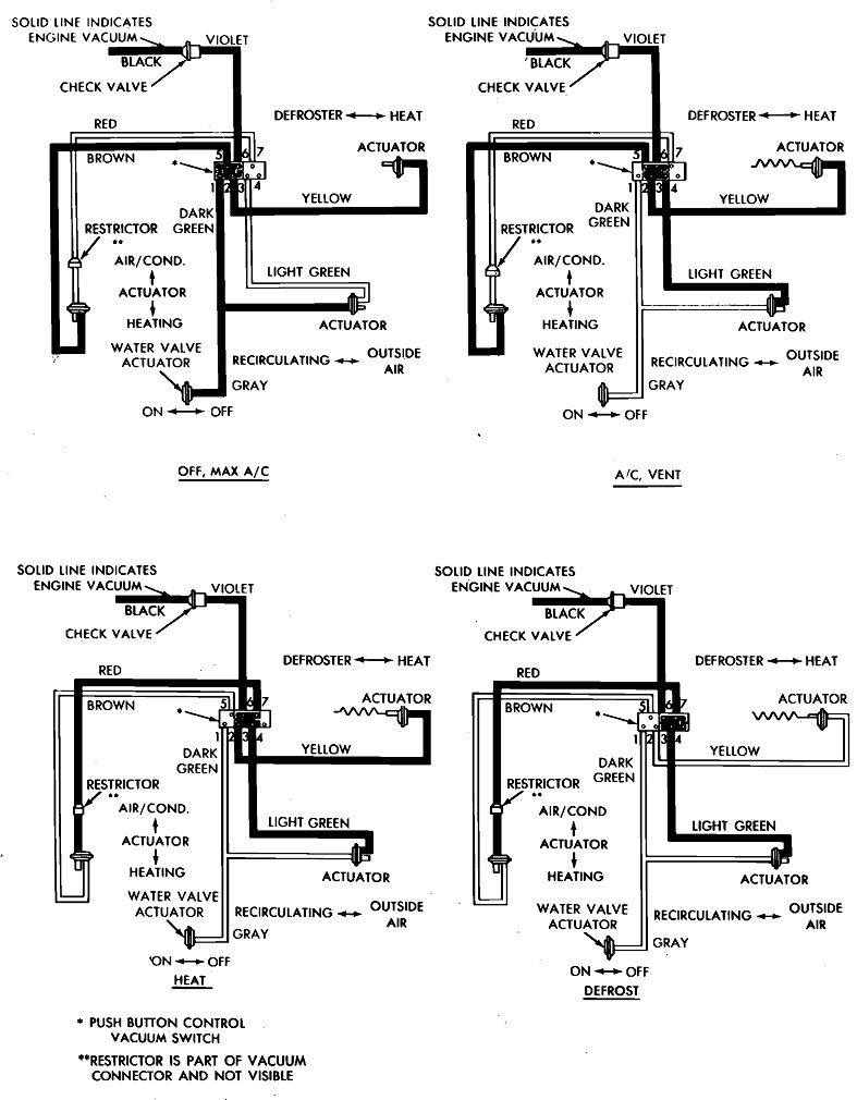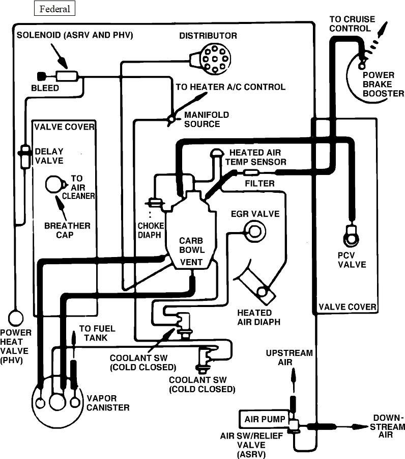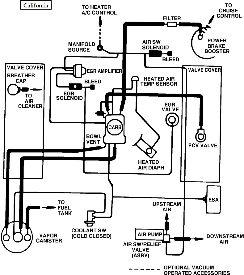 I found these diagrams to help with figuring this out. The first one is a sad drawing of the hose layout. The second is for the 49-state version. Third is for the California version. Next is the PCV system, and the last is for the heating and AC controls.