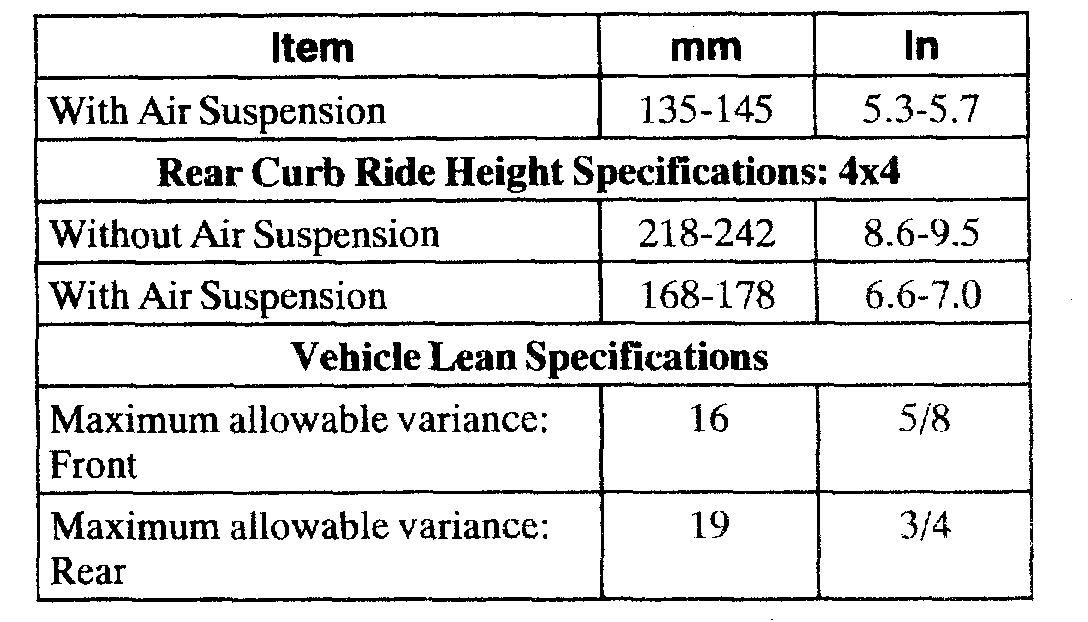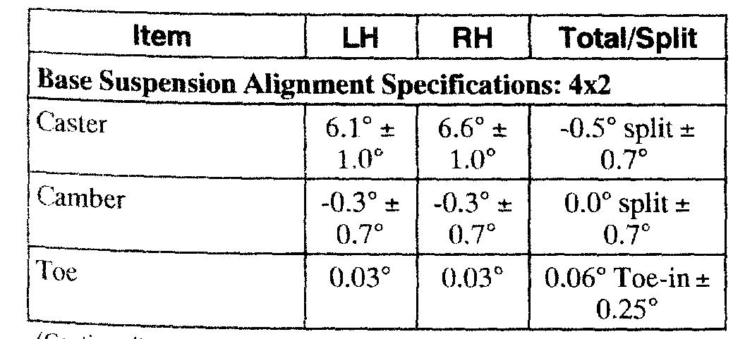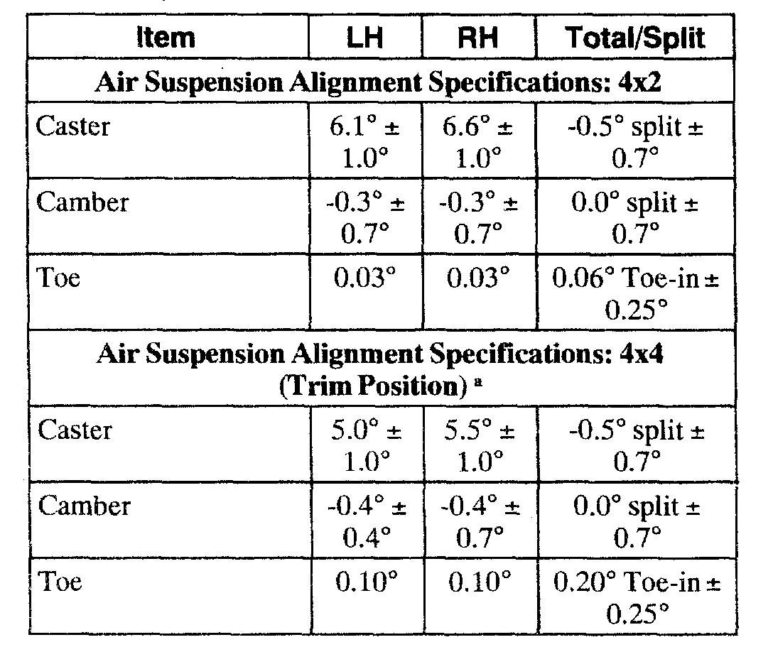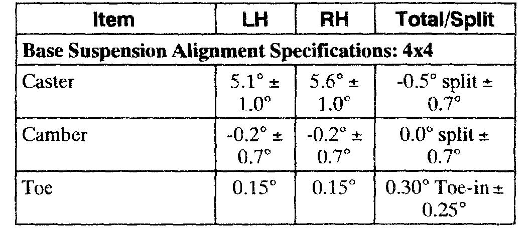 I know that's more wondrous information than you wanted, so to boil it down, here are the alignment specs for your truck with the standard suspension system: