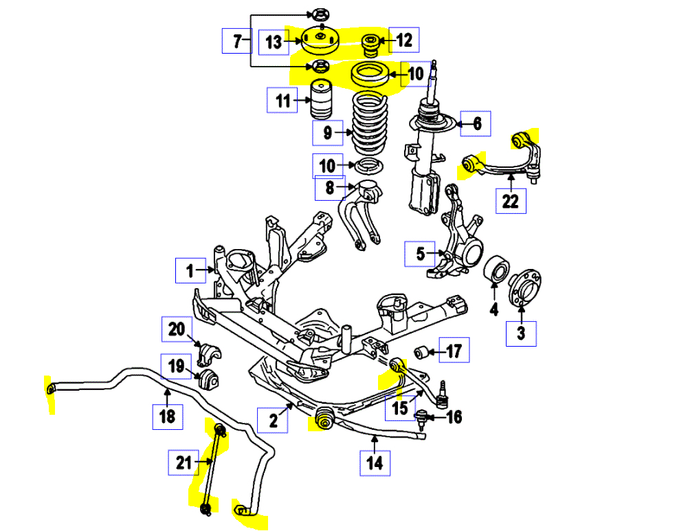 I attached a pic below and highlighted things to check. At the top of the strut is the strut plate. Chances are that is where the noise comes from over bumps.