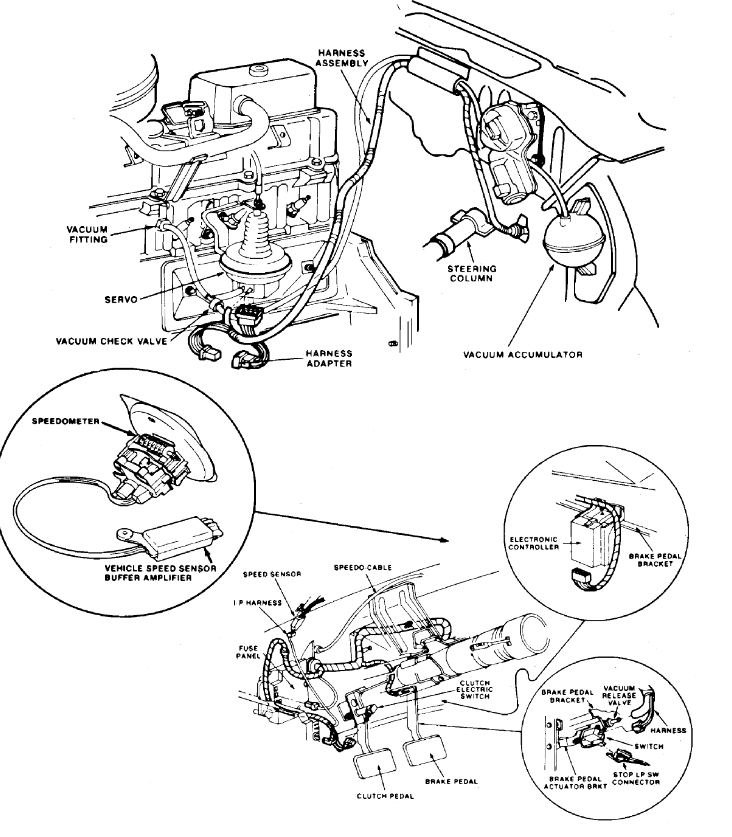 I just reinstalled the cruise control servo into the pickup (had to repair the rubber diaphragm). Everything is plugged in, but the cruise isn't working. I have manifold vacuum connected to the smaller port on the unit, and what I think is the break-controlled vacuum connected to the larger port. Wires are connected as is the throttle linkage. Can you help me diagnose the issue? I think it's electrical, possibly the turn-signal switch, but that's expensive so I don't want to go there first. Is there a fuse for it, or some other way/item to diagnose?