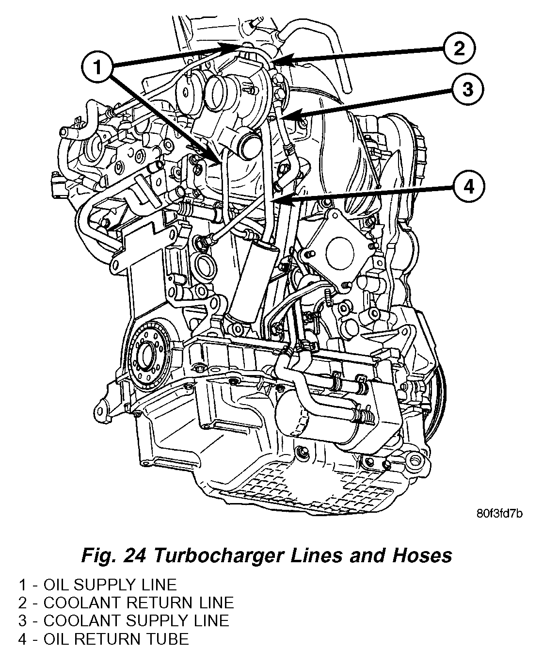 24. Remove turbocharger coolant supply line (Fig. 24).
