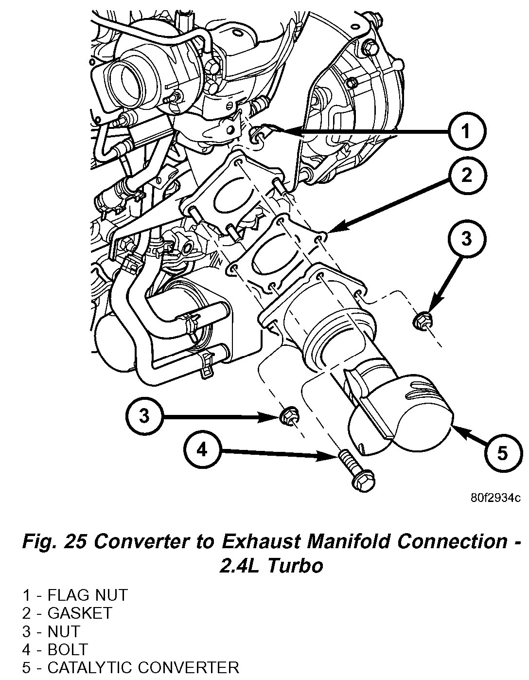 12. Install fasteners securing catalytic converter to exhaust manifold (Fig. 25). Torque fasteners to 28 Nm (250 in. lbs.).