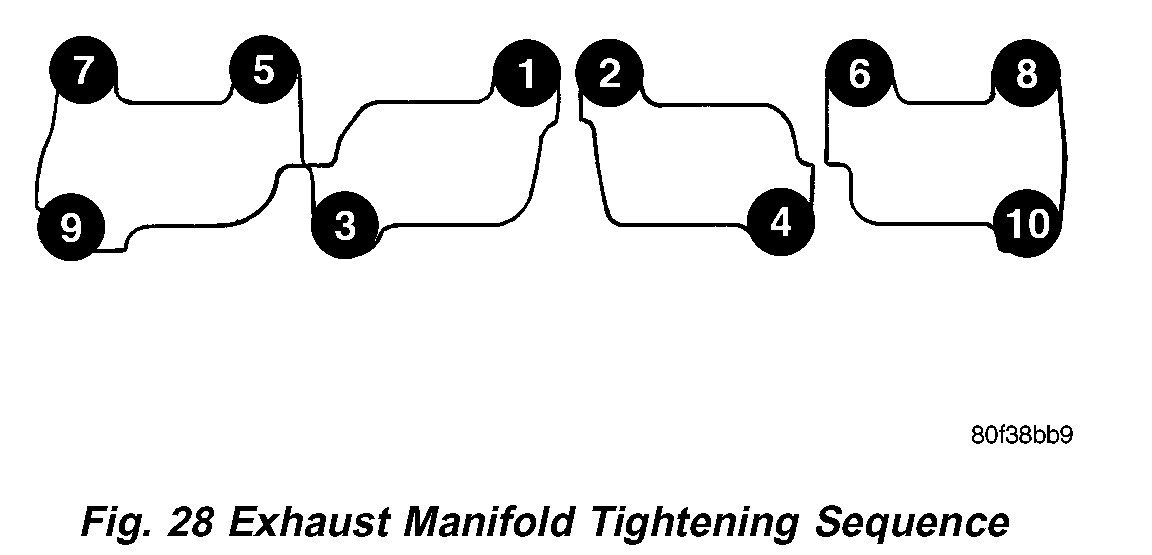 3. Position turbocharger/exhaust manifold assembly in place. Gradually tighten fasteners, starting at center and progressing outward in both directions to 28 Nm (250 in. lbs.) (Fig. 28). Raise and lower vehicle for fastener access as necessary Repeat tightening procedure until all fasteners are at specified torque.