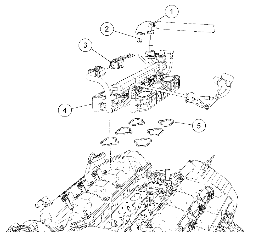 Diagrams 3 and 4 are the Upper Intake Manifold (plastic) from more of a front view, at the bottom of the picture you can see the oil fill cap and oil dipstick.