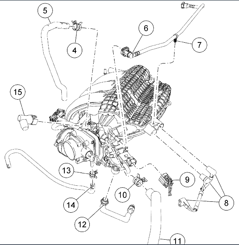 Diagrams 5 and 6 are a side view of the Upper Intake manifold. This is where most of the vacuum hoses, hose to the Brake Booster (11), the Throttle Body just above the number 13 is where the air intake tube from the air filter box will come to.