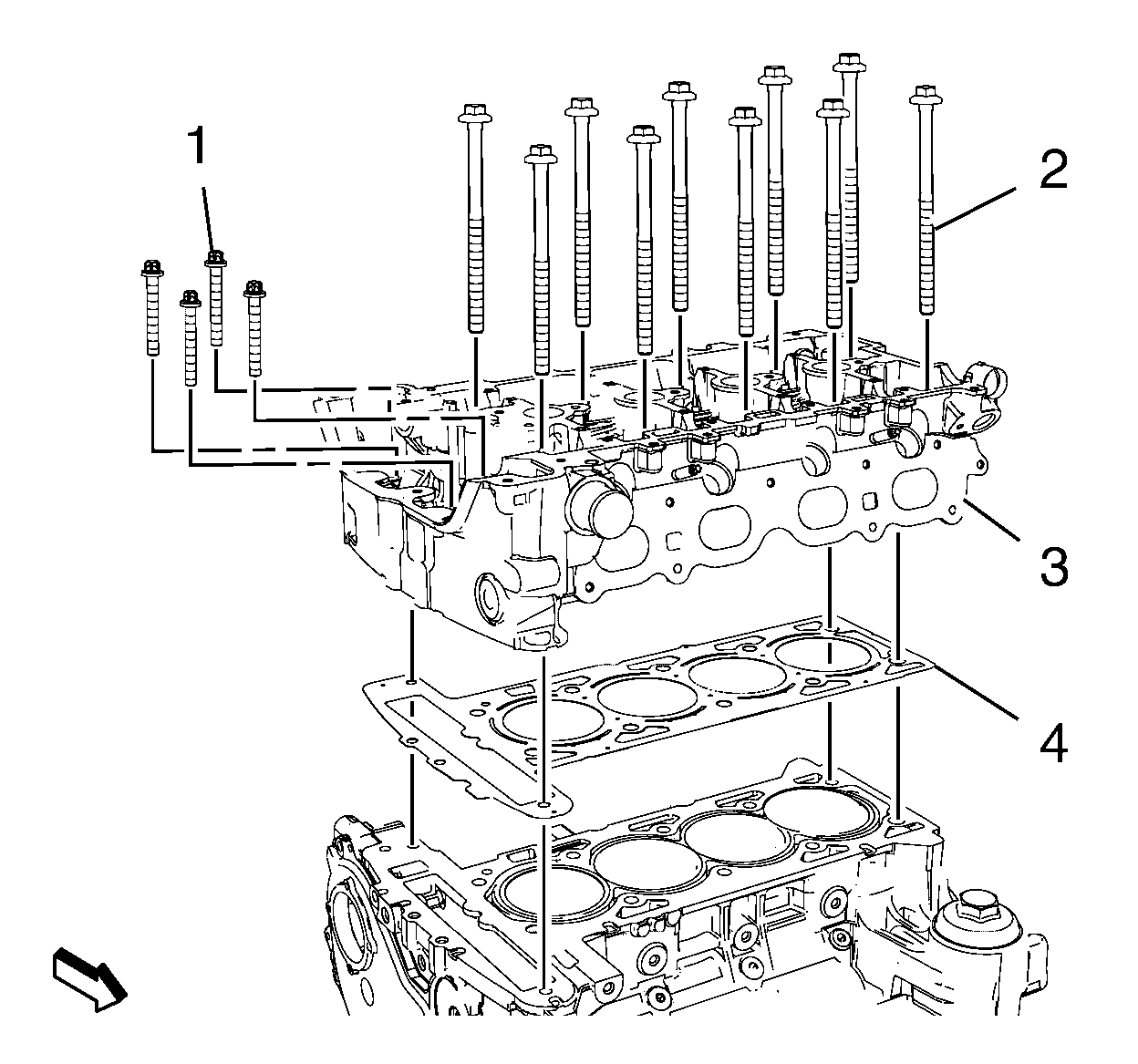 1. Install the cylinder head (3) and the NEW cylinder head gasket (4).