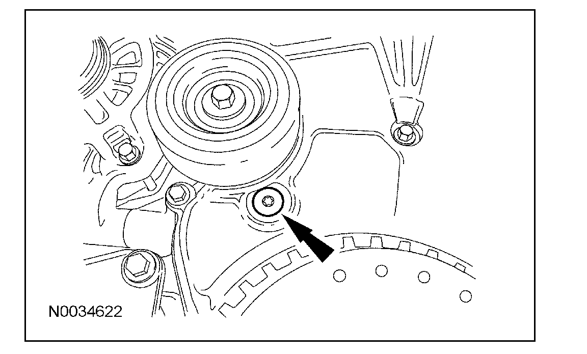 Remove the M6 x 30 mm bolt from the upper front cover timing hole to unlock the tensioner arm.