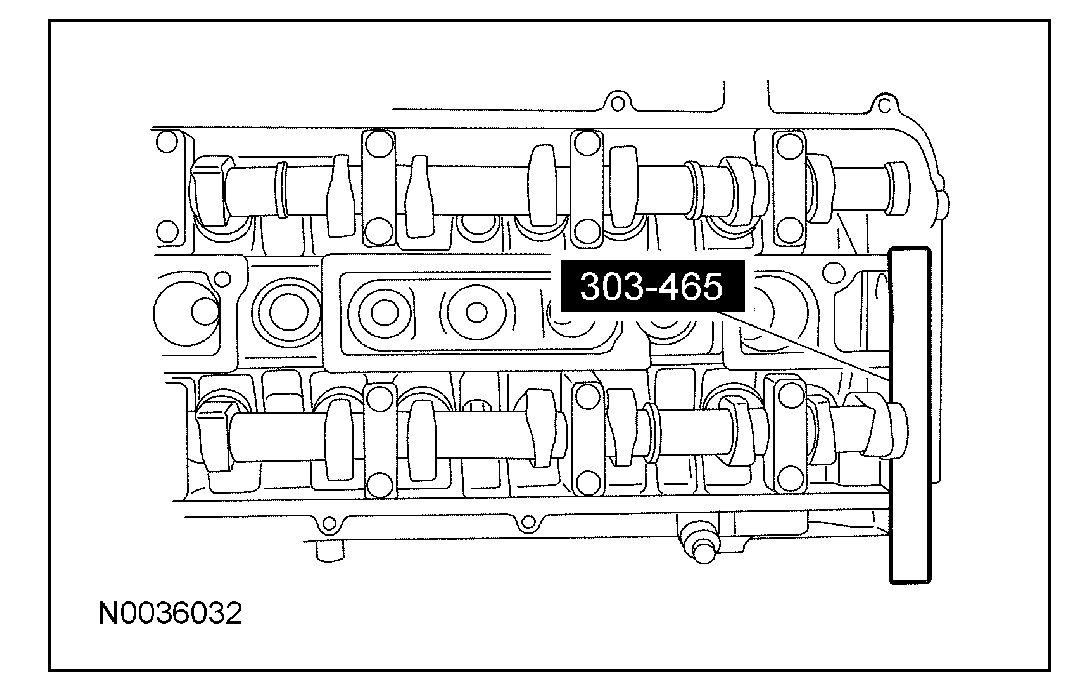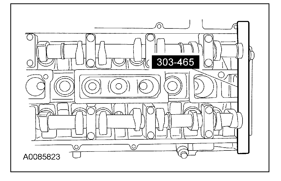 7. CAUTION: The special tool (303-465) is for camshaft alignment only. Using this tool to prevent engine rotation can result in engine damage.