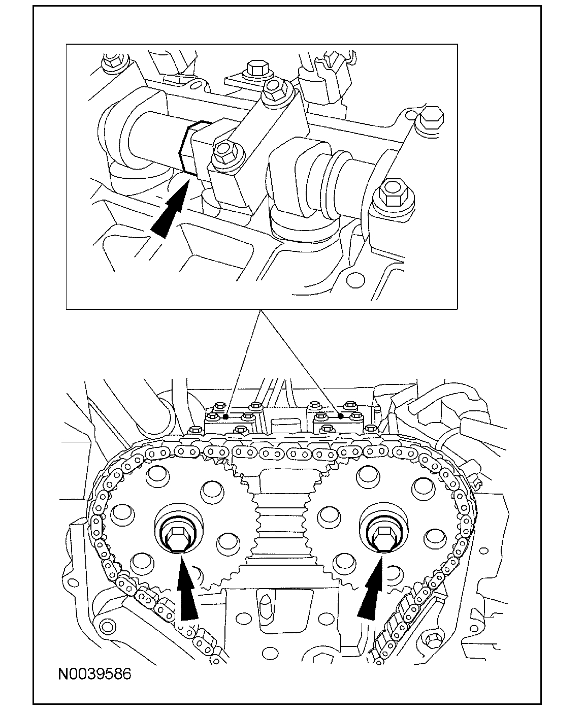 Install the special tool in the slots on the rear of both camshafts.