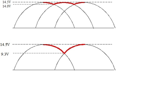 In some other designs, the voltage regulator responds to the low points in the waveform, 14.0 volts in this case. It tries to boost generator output, and while the high points, the 14.5 volts goes up, the regulator still responds to the low points. It keeps on raising output voltage until it can go as high as more than 30 volts. I've reached 35 volts on a test bench. That will destroy computers and burn out any bulbs that are turned on. One thing that can save you is generators are very inefficient at low speeds. Normal generator testing includes the need to raise engine speed to 2,000 rpm. That's where the generator's efficiency picks up and system voltage WILL go too high when the battery is disconnected.