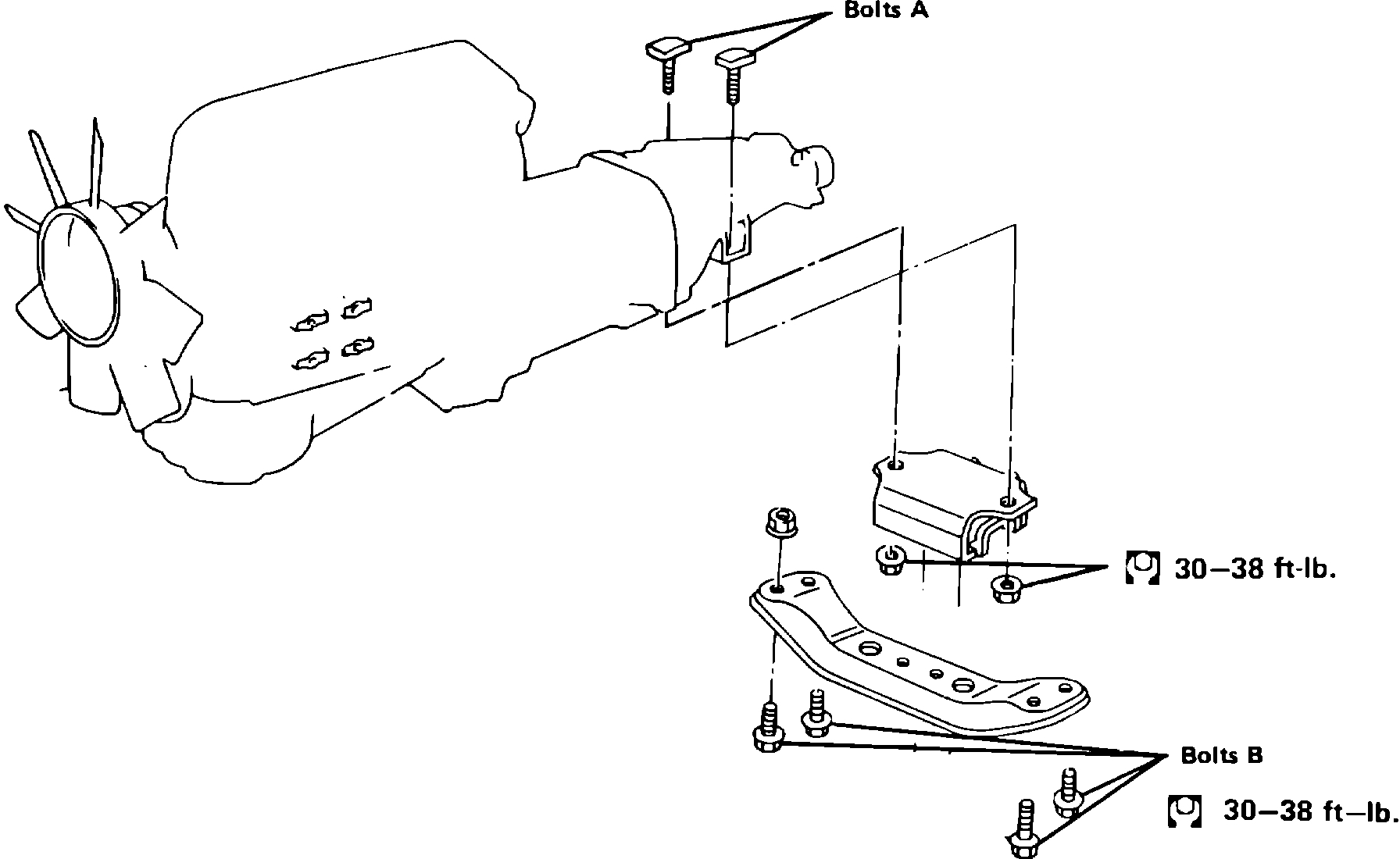 30. Remove the four bolts (17 mm) between the transmission cross member and vehicle frame (Bolts B in Figure 13).