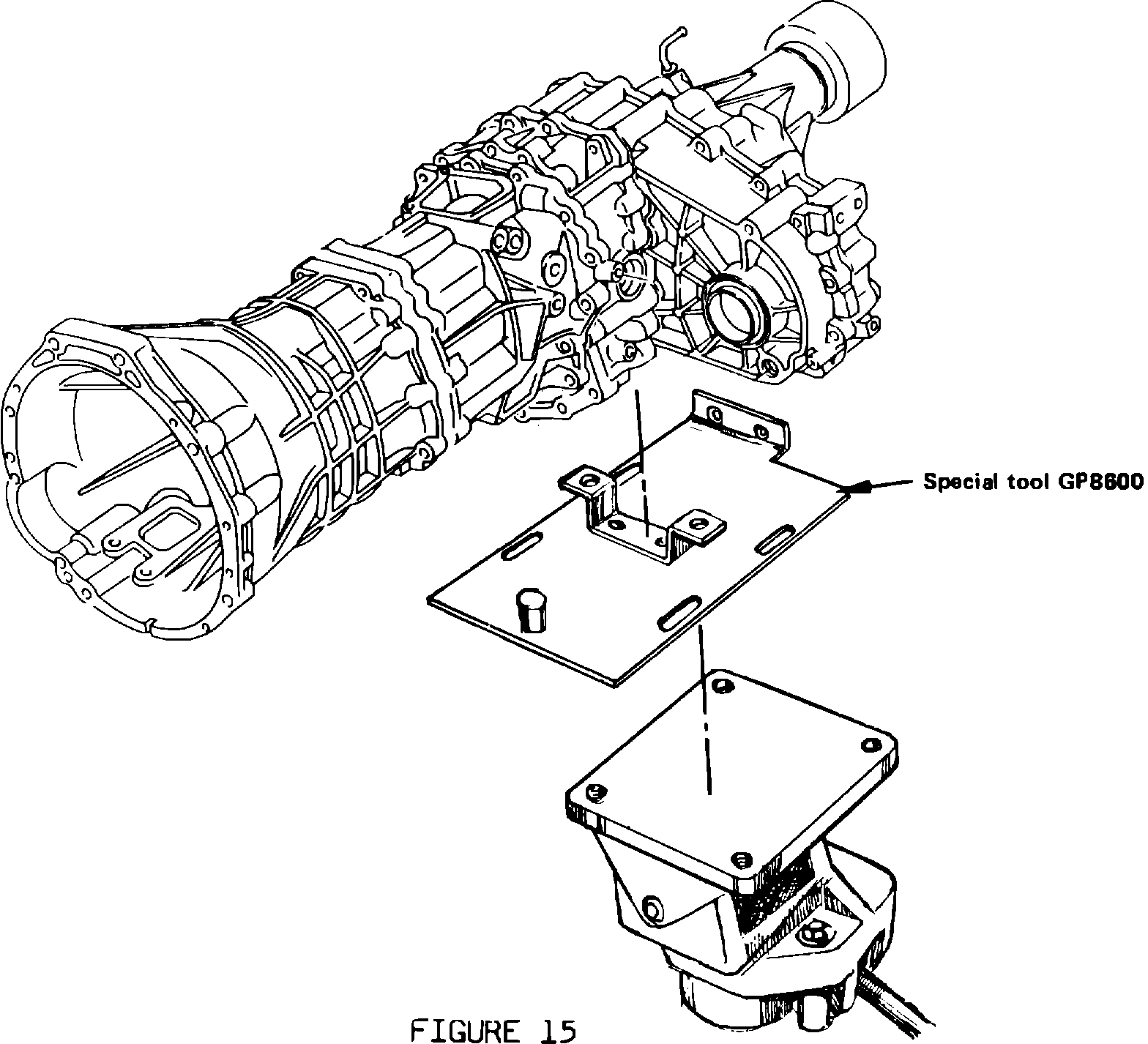 33. Raise the transmission jack and mount the jack adaptor to the transmission/transfer case (two bolts at cross member mount and two bolts at rear of transfer case) (Figure 15).