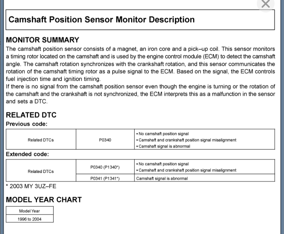I've had it taken for diagnostics and it displays the P0340 camshaft angle sensor error (currently looking for the sensor).