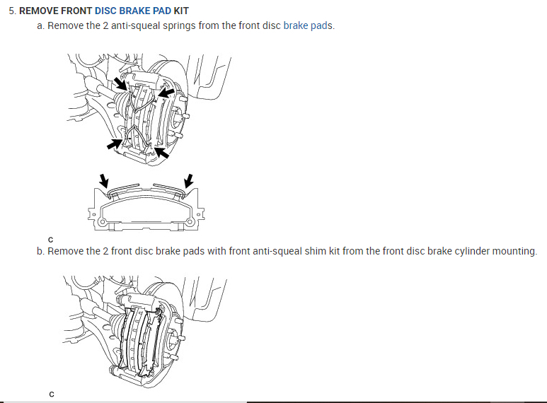 Remove the 2 front disc brake pads with front anti-squeal shim kit from the front disc brake cylinder mounting.