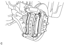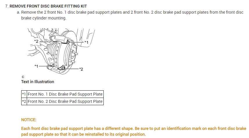 Each front disc brake pad support plate has a different shape. Be sure to put an identification mark on each front disc brake pad support plate so that it can be reinstalled to its original position.