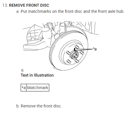 Put matchmarks on the front disc and the front axle hub.