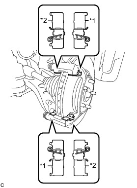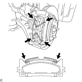 Remove the 2 front No. 1 disc brake pad support plates and 2 front No. 2 disc brake pad support plates from the front disc brake cylinder mounting.
