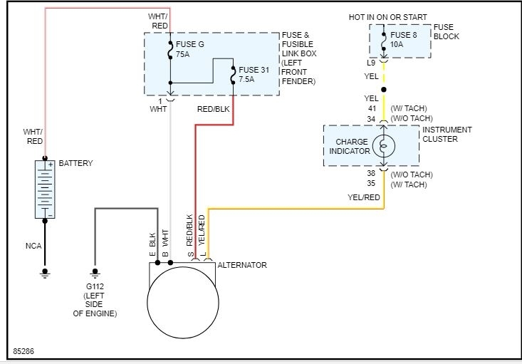 Next, the yellow wire is the turn-on signal that tells the voltage regulator when to turn on and do its thing. That current comes through the warning light in the instrument cluster, so check if that bulb is working. If that bulb never lights up, check fuse 8, a 10-amp in the inside fuse box. Do not worry about the bulb itself. They almost always have a resistor in parallel with them to insure the regulator gets its start-up signal if the bulb has burned out.