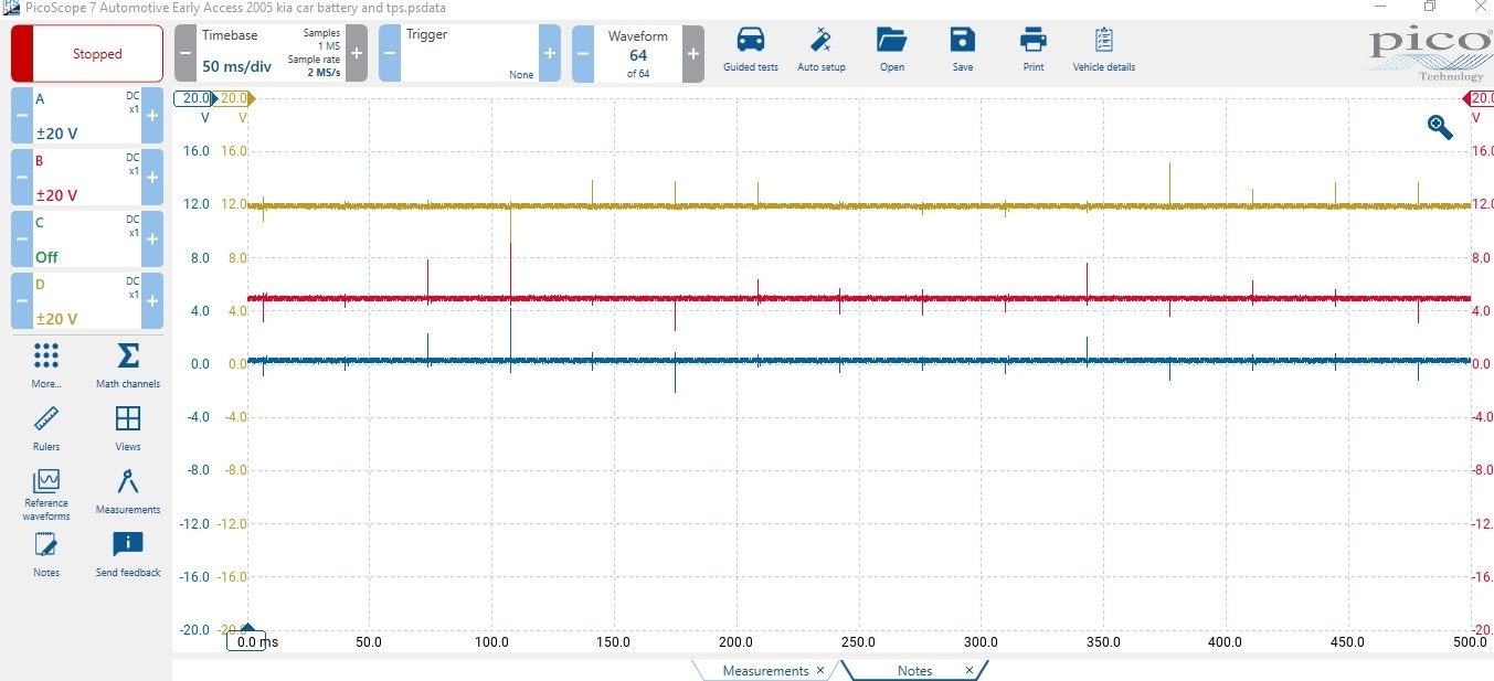 I am posting a screenshot from my PicoScope showing battery voltage on top (yellow), 5 volt reference to the TPS from ECM (red), and signal from tps back to ECM at idle (blue).