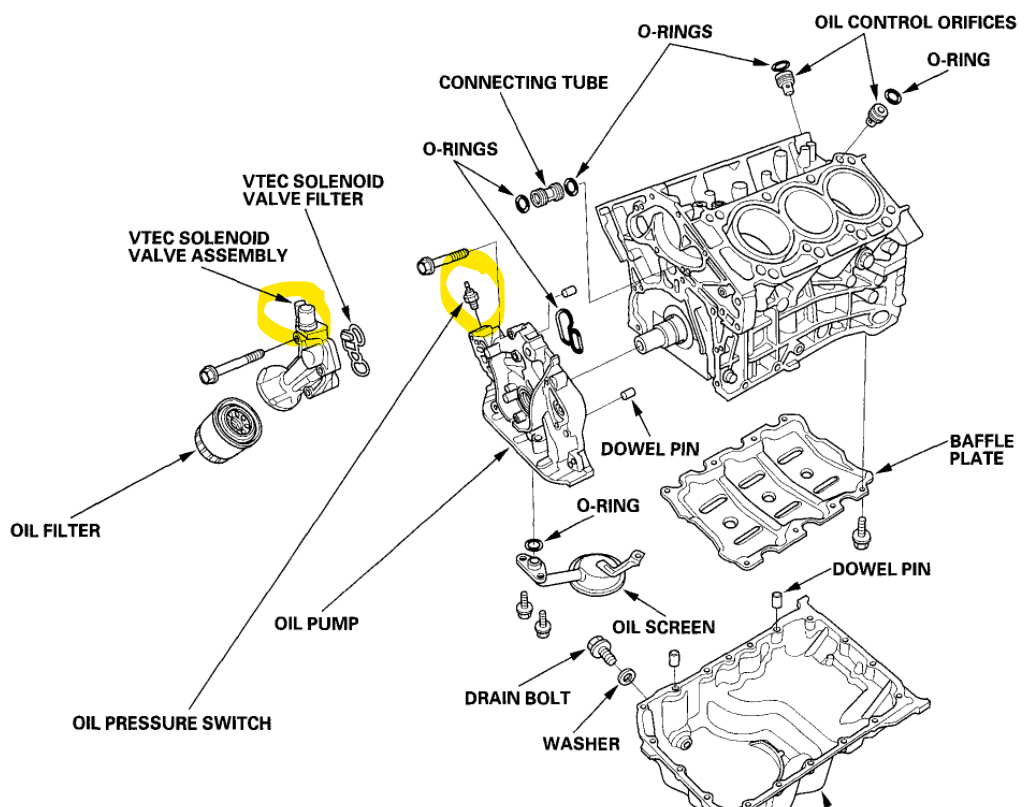 Also, I need to know if the Check Engine Light is coming on when you crank the engine. That will tell us if the ECM is being powered up or not. Thats a major factor here. But my other worry here is if you don't find a blown fuse, since the Vtec solenoid is powered directly from the ECM and what I think happened is the wire hanging there shorted out and may have damaged the ECM, Now the ECM is protected by fuses, but they are on the power feeds to the ECM, not on its outputs. So, if there is no internal resistor or protection on that power feed, which I think there should be technically, It may have damaged a driver or transistor inside in the ECM.